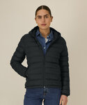 Women’s padded jacket. Fitted. Set-in sleeve. High collar with grown-on hood. Hood opening and bottom hem have an adjustable plastic stopper and elastic cord. Reverse nylon zip at centre front. Zipped welt pockets with extra grosgrain puller. Fully quilted. Side panels for a better shape. Self-fabric elasticated cuff. Inside seams with binding finish. Bottom hem has an adjustable plastic stopper and elastic cord.